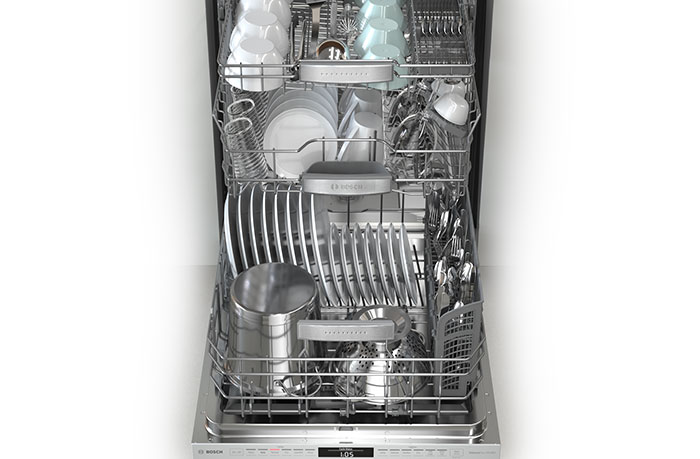The MyWay Rack from Bosch was inspired by consumer dishwasher loading habits and offers the industry’s largest third-rack loading capacity. The tiered rack offers space for large bowls/utensils and a silverware insert with foldable tines, creating more space for other items throughout the dishwasher. The tiered angle of the rack also creates space for stemware in the top rack, freeing up space for other items below.