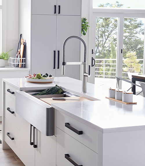 “The epiGranite Workstation Sink from Ruvati is made of granite composite sourced from Germany. We designed a workstation sink with this material and incorporated accessories made of glass, wood and stainless steel.” – Douglas, Ruvati