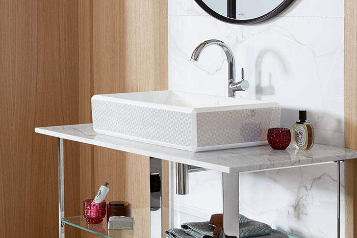 The Antheus Collection from Villeroy & Boch reflects classic style elements inspired by Art Deco and Bauhaus styles. The Antheus washbasins are reminiscent of 1920s ceramics and are made from TitanCeram, a proprietary ceramic material developed by Villeroy & Boch to allow for sharply defined edges and a radius with thin walls.