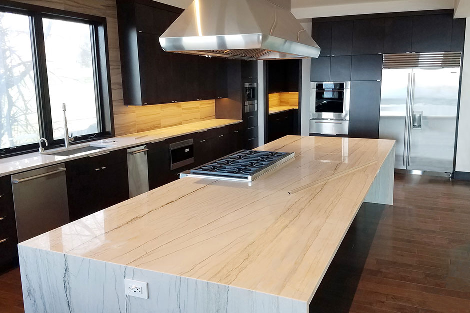 The final design incorporated the use of ¾-in. panels to provide a wrapped look around the cabinets, which were black. This contrasted the marble-look countertops and the stainless steel hardware and appliances.