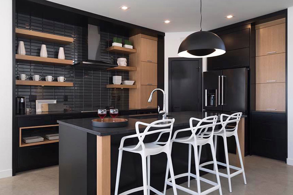 This was a show home for a builder, so it was important to have everything perfect for their grand opening. The builder wanted an industrial, modern look. Bartel had many discussions with the builder to determine what materials to use, and they finally agreed upon the combination of vintage black and rift-cut white oak cabinets. The resulting kitchen is a mixture of elegance and natural appeal, complete with open shelving and black subway tile.