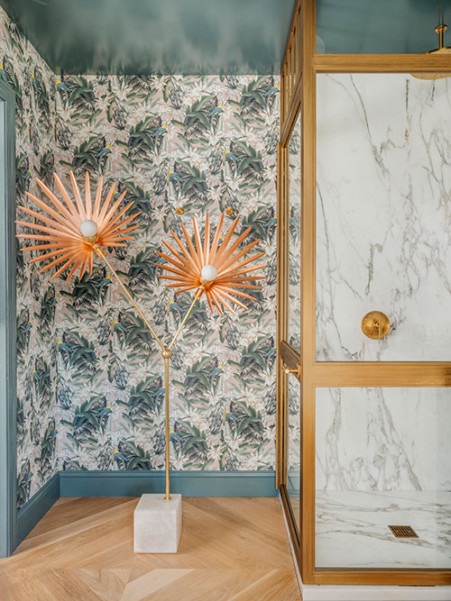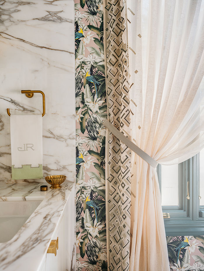 Designer Julie Rootes of Corte Madera, Calif.-based Julie Rootes Interior Design was charged with renovating one of the bathrooms, which she named L’espace Tranquil for its peaceful yet elegant appeal. The space juxtaposes Pierre Frey floral wallcoverings, shell sconces and a marble accent wall for a mix of historical and modern charm. KBB spoke with Rootes to find out more about her design.