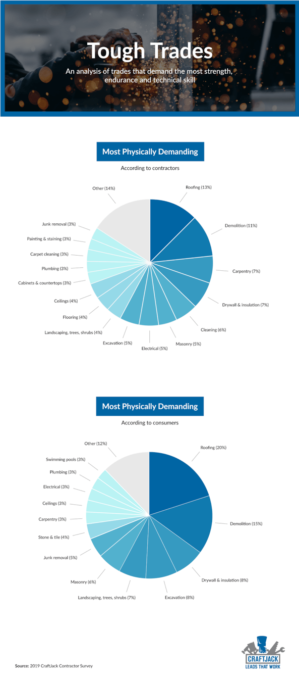 Consumers and contractors agreed roofing and demolition are the most physically demanding trades. And while contractors voted carpentry as the third-most physically demanding trade, it barely cracked the top 10 for consumers.