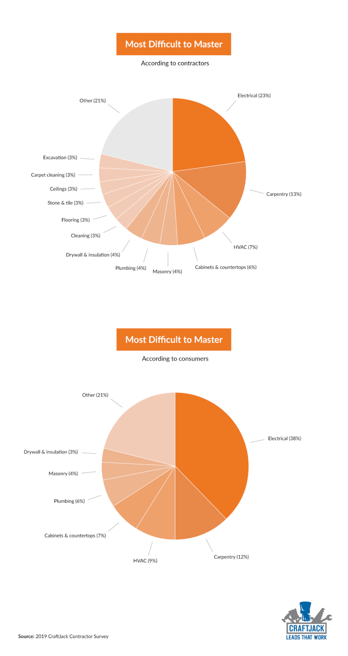 Of course, muscle isn’t all you need on a job site. It takes many years of training, patience and humility to fully command some trades and consistently produce masterful work. So, we asked each group about what sort of work is most difficult to master. There was more agreement this time – both consumers and contractors rated electrical, carpentry, HVAC and cabinets/countertops as the most difficult to master.