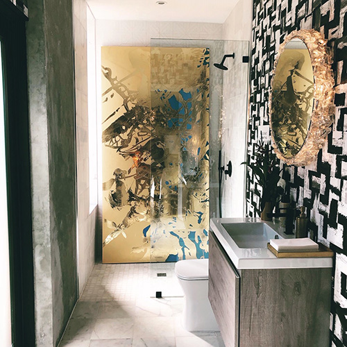 In the game room, the design partners created a fun space with graphic elements and an organic feel. The adjoining bath creates an ultra-luxurious feel with a simple freestanding vanity, a black-and-white backsplash and gold elements like the slab used in the shower.