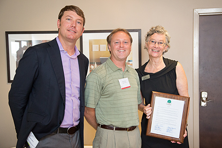 MTI Baths Russell Adams and Kathy Adams receiving a plaque from Sugar Hill, Ga., Mayor Gary Pirkle (center).…