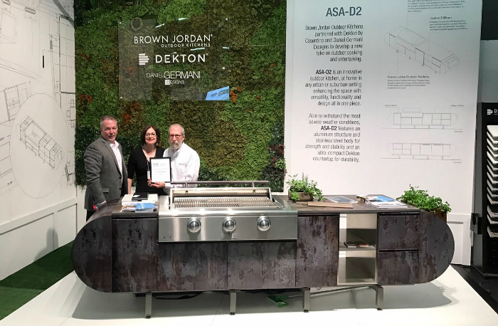 Most innovative booth design went to Brown Jordan Outdoor Kitchens. The company collaborated with Dekton by Cosentino and Daniel Germani Designs to create the ASA-D2, which features an aluminum structure, stainless steel body and a Dekton countertop for durability. It was showcased in the booth Germani designed using a wall of plants and enlarged design drawings.