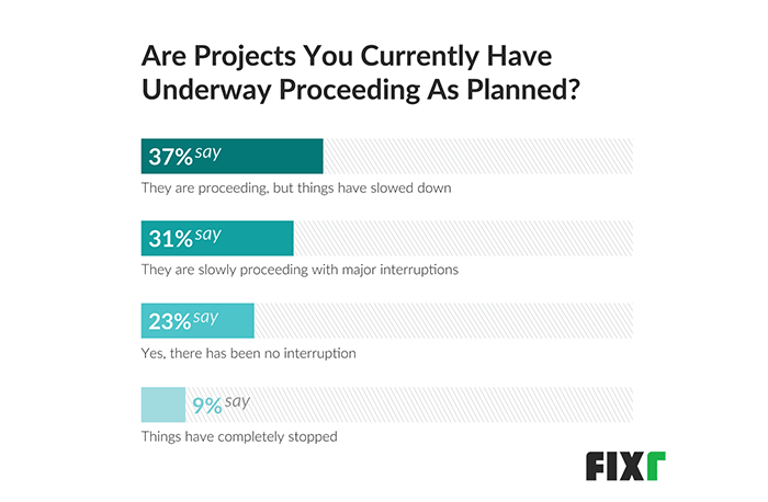 Most experts report that homeowners are putting off new, planned projects, but only for a short period of time. A smaller percentage – 29% – want things to proceed as scheduled. 17% of clients are also stopping their projects indefinitely. Because things are changing rapidly still at this stage, it may be that most homeowners are optimistic about their ability to start again soon.