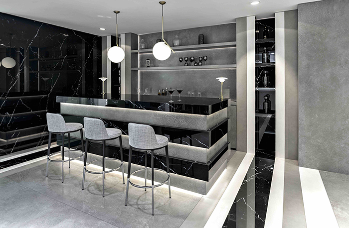A comprehensive and holistic display, Neolith HQ Showroom assembles a vast array of the brand’s most popular and recently launched patterns and colors in a multitude of applications. Those entering the space are immediately drawn to a visually striking two-tone bar in Nero Marquina Polished and New York-New York, perfectly capturing the material’s ability to add refinement to a setting.