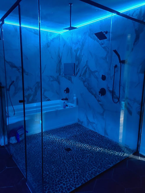 Finally, the $500 Honorable Mention winner was Danielle Cambre who truly showcased the ability of RGB Tape Lighting’s micro-waterproof coating in a Master Bathroom addition to an existing home. Cambre’s client wanted to have mood and accent lighting whether they were showering or relaxing in the bathtub. They also added color-changing RGB Tape Lighting to the bathroom cabinet’s toe kick.