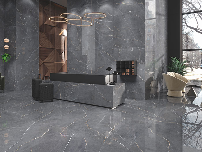 From intricate veining patterns to warm golds and cool silvers, the desire to indulge in eye-catching ceramics is trending. Large-format slabs with smoky marbled streaks combine with the soft shimmers of iridescent details to create glamorous interiors.