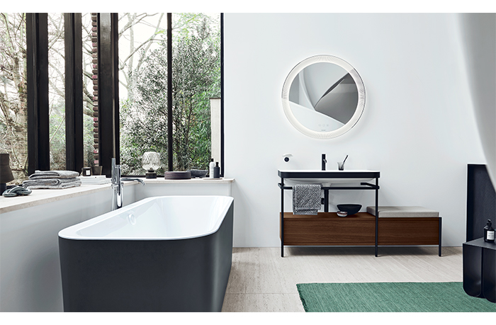 The new c-shaped and c-bonded bathroom additions reinforce the design language of Happy D.2 Plus. Expressive in style and elegance, the Happy D.2 Plus c-shaped washbasin is available with a ceramic, glossy white outer edge in combination with a vanity unit or metal console in chrome. Happy D.2 Plus c-bonded washbasins incorporate a rounded outer edge in the same color as the vanity unit or to match the metal console in black matte that they pair with. The new additions are available in three widths (22 5/8, 30 1/2 and 38 3/8 inches) and are designed to seamlessly combine with products from the Happy D.2 and Happy D.2 Plus series. Duravit and Sieger Design are also expanding the collection with a floor-standing metal console. Streamlined in form, the console is available in the standard chrome as well as black matte. Shelving and drawer units can be integrated for more storage. A seat with a comfortable cushion can also be added on the left or right.