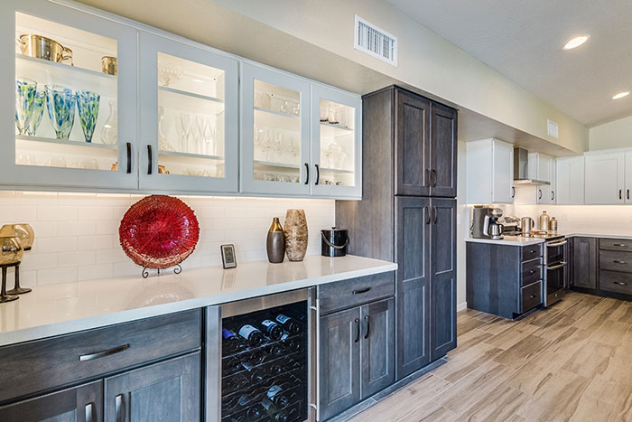 A kitchen, master bath & powder room are outfitted with a sophisticated, bold design