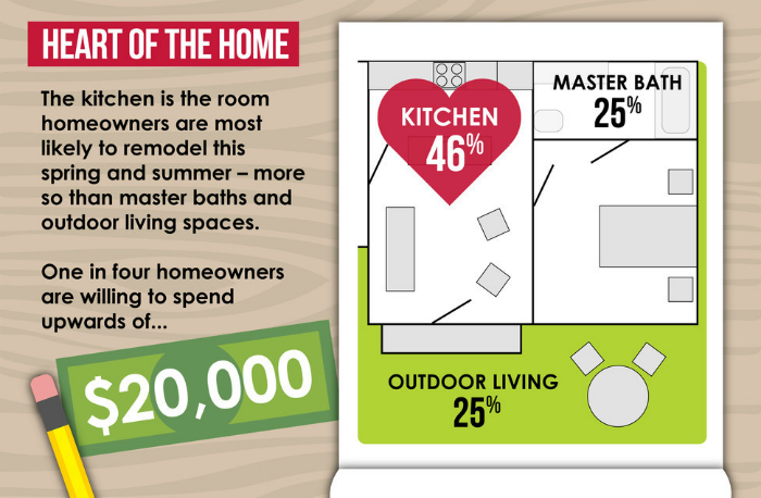 Delta Faucet revealed the results of its biannual Homeowner Index survey, which found one in four Americans would spend upwards of $20,000 on their kitchen remodel this season. With an overwhelming majority of homeowners (89 percent) planning to host a summer gathering, it comes as no surprise that nearly half (46 percent) of respondents named the kitchen the room they would be most likely to remodel.