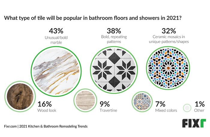 When asked about the most popular tiles for the bathroom, 43% of interior design experts agreed that the top option will be bold or unusual marble. Sahara Gold and Breccia Oniciata are good examples of these special types of marble. These and other bold types come in different colors, usually with striking veining. As the second and third options, experts chose bold, repeating patterns and ceramic mosaic in unique shapes. Taking a look at their preferences, it seems homeowners who are remodeling this year are ready to make a statement.