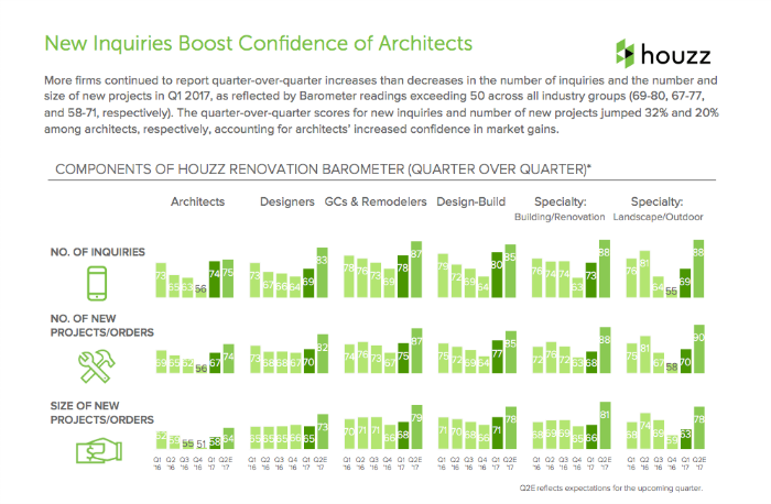 “While confidence remains high across industry groups, the high expectations for 2017 reported at the start of the year have been put a bit on hold due to weather conditions,” said Nino Sitchinava, principal economist at Houzz. “Winter storms in the Northeast and rains in the West prevented many outdoor and exterior project inquiries converting into jobs in Q1, somewhat affecting professional confidence among specialty firms. Yet, expectations for Q2 are strong, and renewed confidence among architects signals larger scale projects on the horizon.”