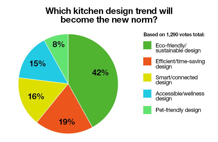 So maybe our question, “What kitchen design trend do you think will become the new norm?” should have been referring to lifestyles instead. At any rate, we asked about eco-friendly/sustainable design; accessible/wellness design; pet-friendly design; smart/connected design; and efficient/time-saving design.
