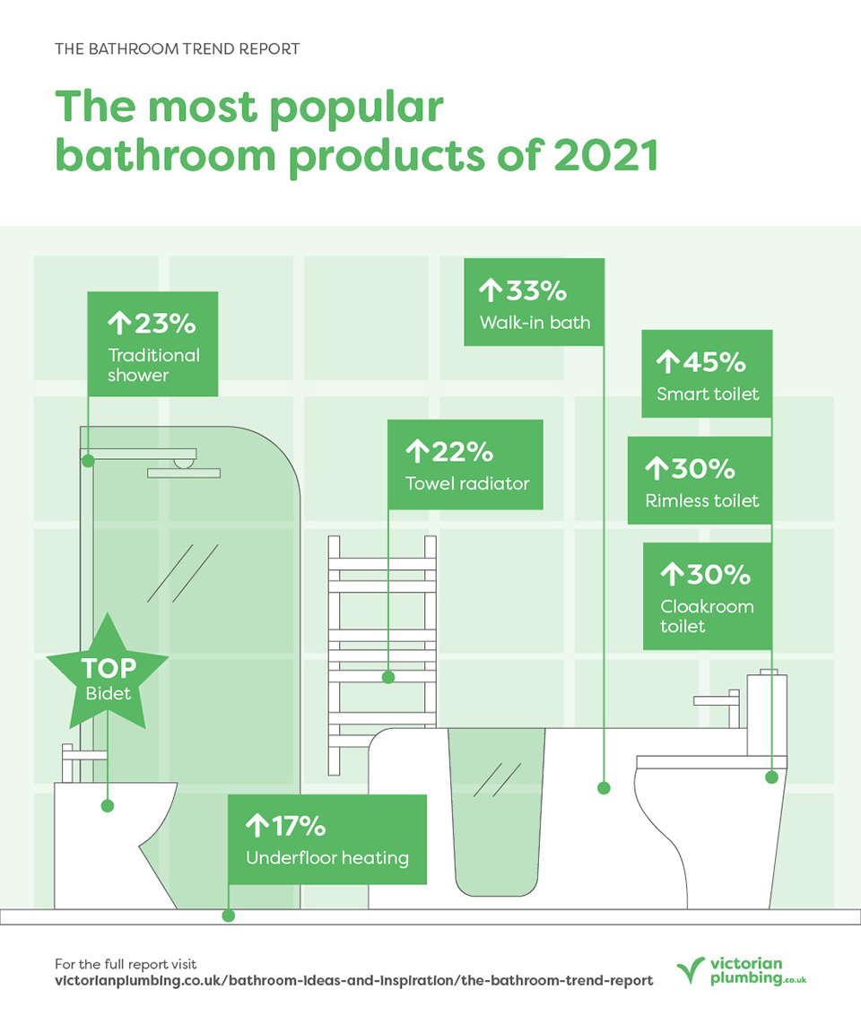 Perfect for people with reduced mobility, walk-in baths remove any risks involved with stepping onto wet surfaces, allowing for an even more relaxing experience. Freestanding tubs in the 2021 bathroom remain as popular as ever though, and if you’ve got the space, they can act as a real centerpiece. Even though they might have seen a slight 6% dip last year, they still amassed more than half a million searches.