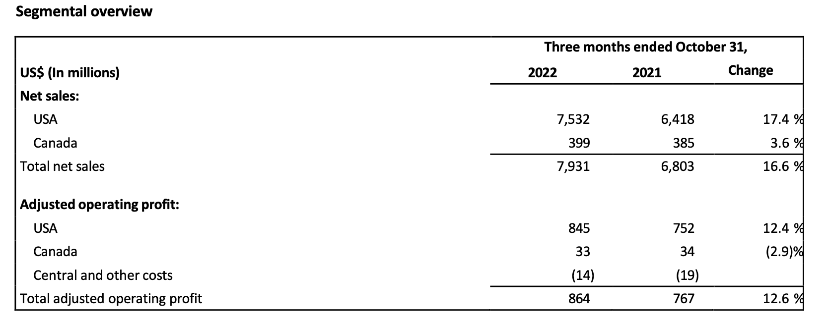 Reported operating profit was $831 million, 12.4% ahead of last year. Adjusted operating profit of $864 million, increased 12.6% compared to last year.