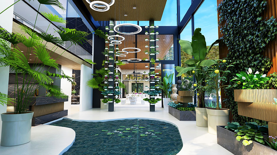The floor plan of the virtual designer showhouse reflects how homes will need to function in the future, in light of the pandemic and the changing needs and priorities of today’s luxury homeowner. This includes: a separate ZOOM room adjacent to a full office that converts to a guest bedroom; a laundry room that also contains a decontamination zone, a sanctuary room and terrace; a three-story live indoor farm to grow food and herbs; a family room that converts to a schoolroom for virtual learning or homeschooling; an open-plan dining room and living room; an indoor lounge; a principal suite upstairs with a spa-like bathroom for recharging and refreshing; and an outdoor living area.