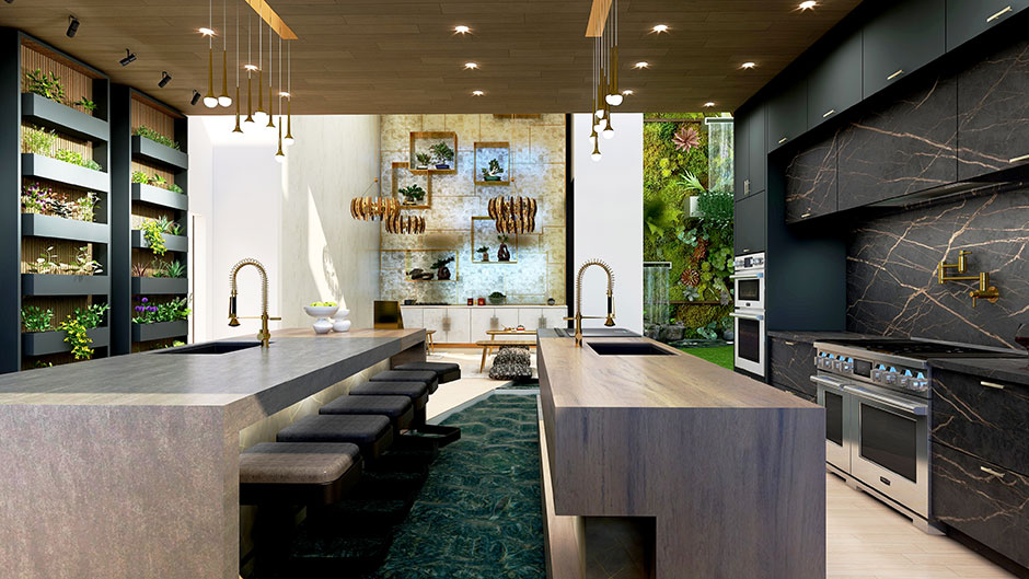 Learning About Indoor Farming. “My favorite part was researching hydroponic farming and sustainability within a home. We wanted to make hydroponic farming ‘sexy’ and seen in a different light. We designed hydroponic sliding panels that grow food but also help provide functional storage for the kitchen.” – Lovato