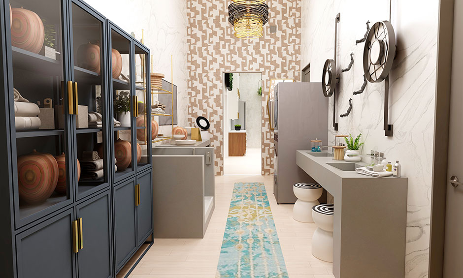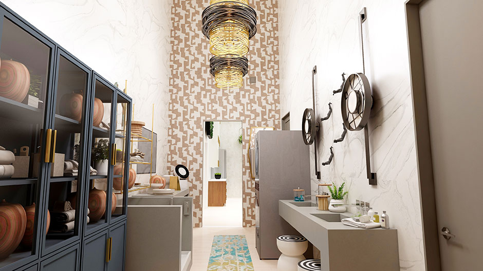 The New Laundry Room. “My concept was ‘style-meets-sanitation’ in this Malibu laundry/decontamination room. With a global heightened attention to wellness, hygiene and sanitation, my goal was to create a space that was focused on clothing sanitation, good air quality and hand hygiene but still feel luxurious and stylish.” – Moriarty