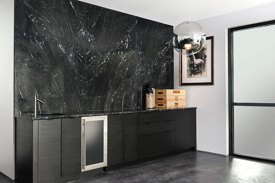 Pantry Cabinetry: Touchstone Cabinetry Countertop: Midwest Stainless Steel Fabricators Dishwasher: Miele Faucet: Blanco Hardware: Epco Refrigerator: U-Line Wet Bar Backsplash: Nero Marquina Counter: Shambala Granite Finger Pulls: Edco Flooring: Stained Concrete Wine Cooler: Uline Laundry Room/Office Cabinetry: Stossa Countertops: Formica Sink: Kohler