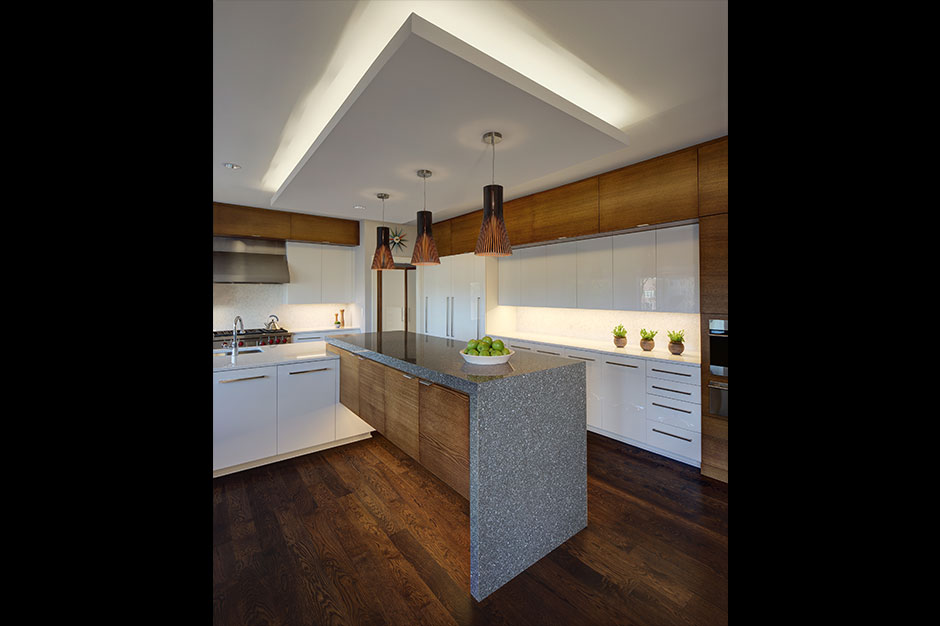 Finally, Dohr designed the main lighting above the island to come from behind a “floating” ceiling panel above the island. There are also three pendants to add further interest.